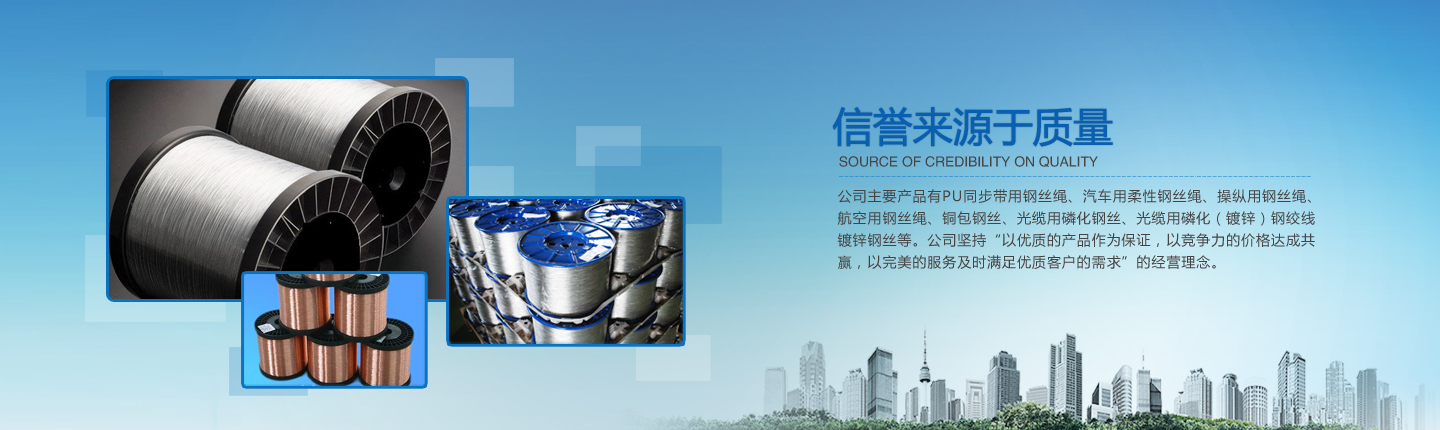 公司主要產(chǎn)品有PU同步帶用鋼絲繩、汽車用柔性鋼絲繩、操縱用鋼絲繩、航空用鋼絲繩、銅包鋼絲、光纜用磷化鋼絲、光纜用磷化(鍍鋅)鋼絞線、鍍鋅鋼絲等。經(jīng)過多年的研究、摸索、開發(fā),公司已形成了完整的技術(shù)、工藝軟件,產(chǎn)品實(shí)物質(zhì)量均達(dá)到國際先進(jìn)水平。